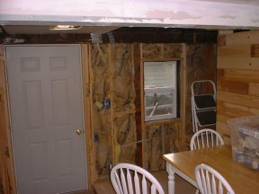This is the back wall of the New Den Built in the basement. This house was built in the 1890's and the walls were sitting directly on the ground and rotting away. The back of the house was 3 to 4 inches lower then the rest of the house. The back end of the house was jacked up to match the rest of the house and a cement footing and this wall was installed. Along with the wall, a new back door and windows were installed also. This room is not completed yet but will be finished in another phase of the remodel.