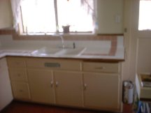4x4 tiles installed for counter top and backsplash, white with rose trim.